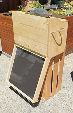Es eignet sich für kleine bis mittlere Mengen und wiegt ca. 7kg. Es lässt sich sehr leicht tragen und kann auf einen Tisch oder eine anderen Ablage gestellt werden für die Trocknung. Mithilfe von Steinen kann ein kleiner Wärmespeicher eingebaut werden, welcher den Trocknungsvorgang in den Abendstunden verlängert.